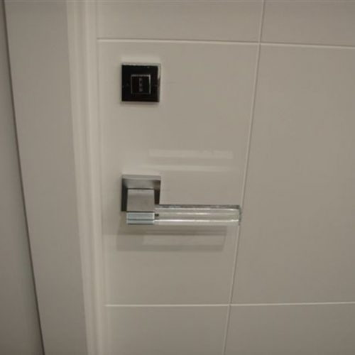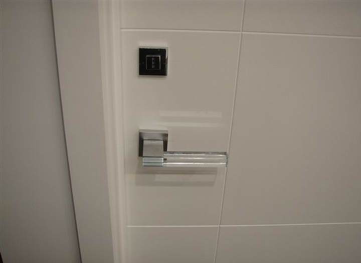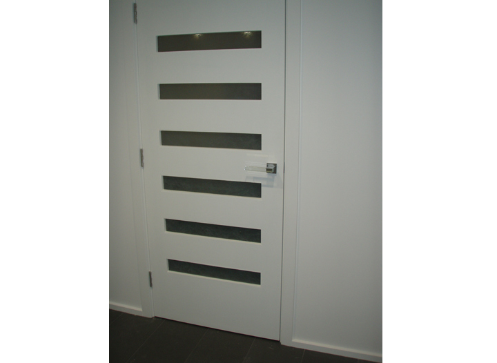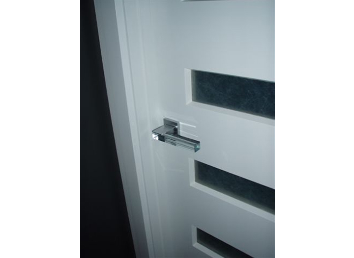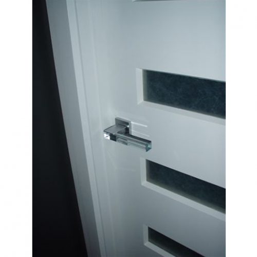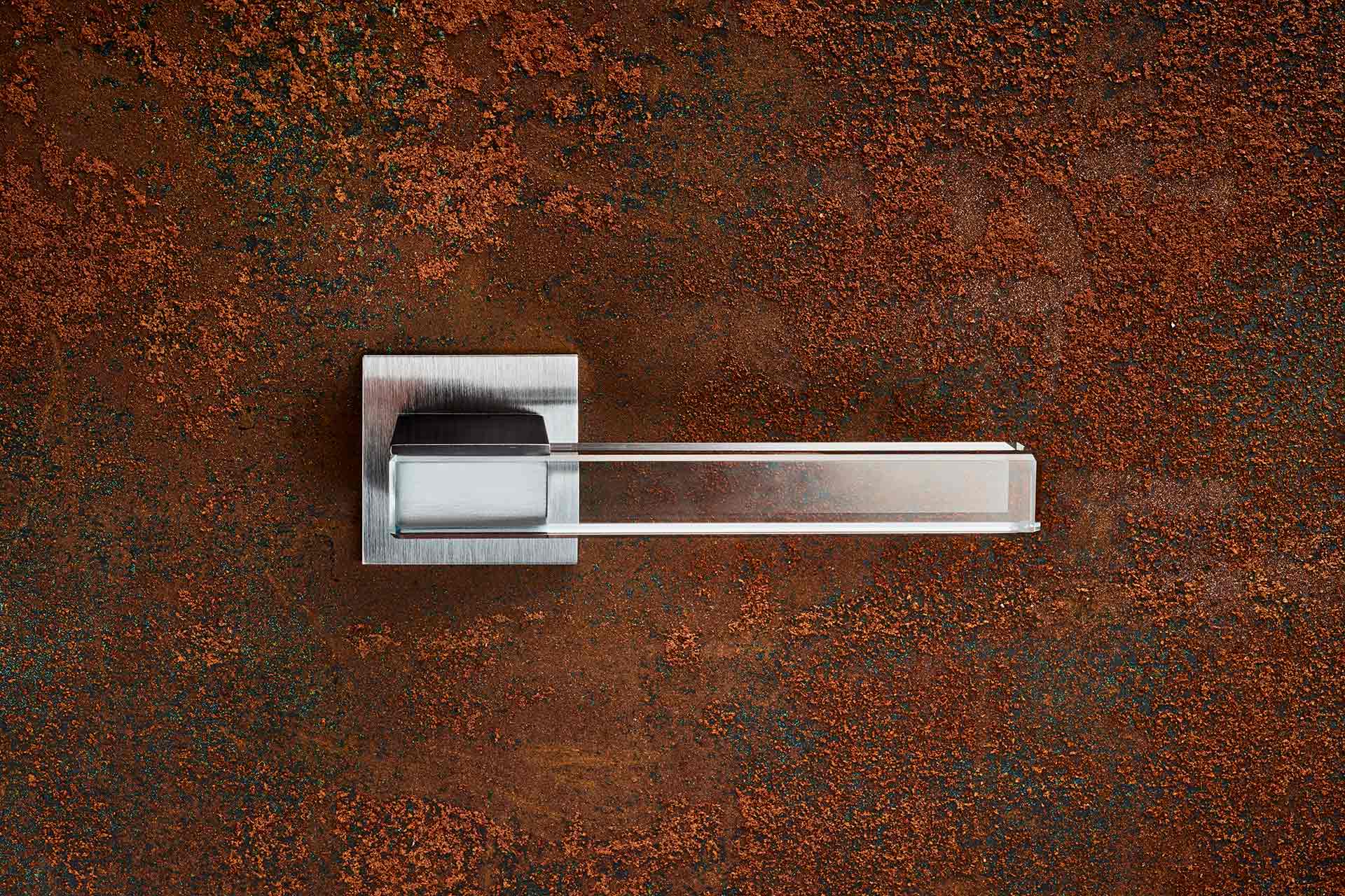 The point of connection between the glass and the flap of the L-shaped metal shaft is resolved by means of structural adhesive.