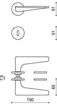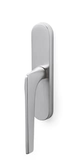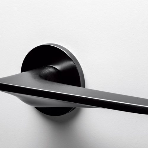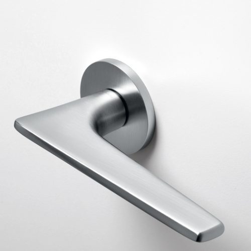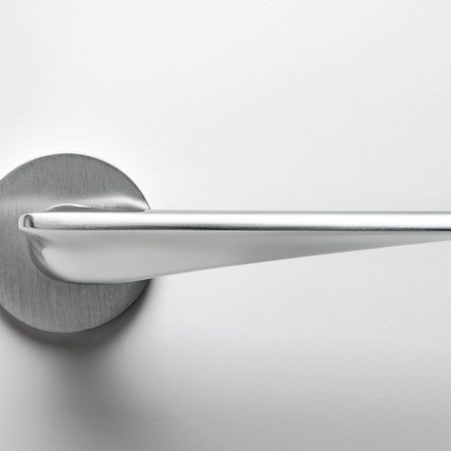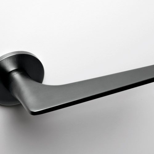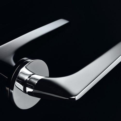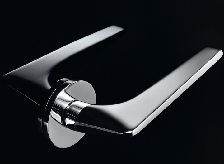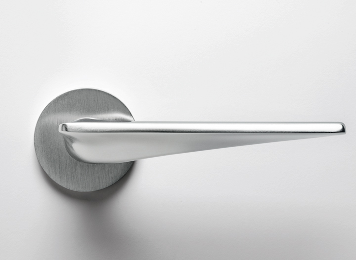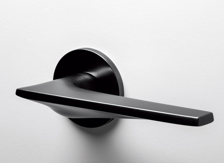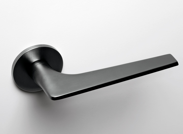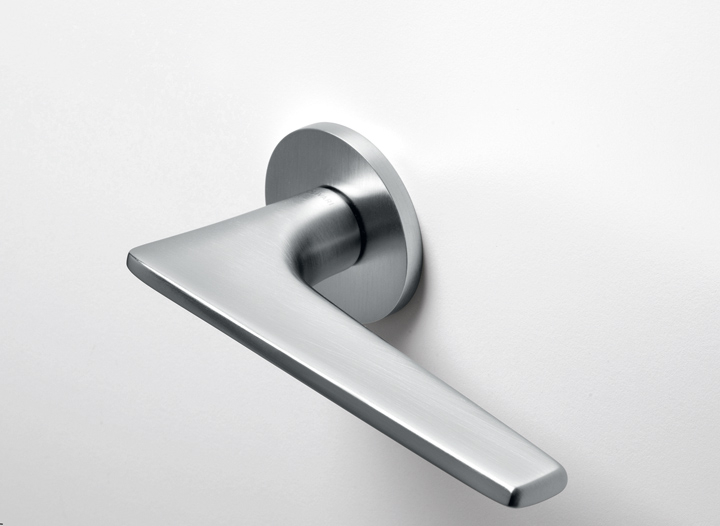 The volume that curves and then flattens on the underside of the lever comfortably fits the grip of thumb and index finger, while the flat upper surface reacts to the pressure generated by the palm of the hand. A three-degree inclination toward the door has the function of facilitating the hand’s grip.