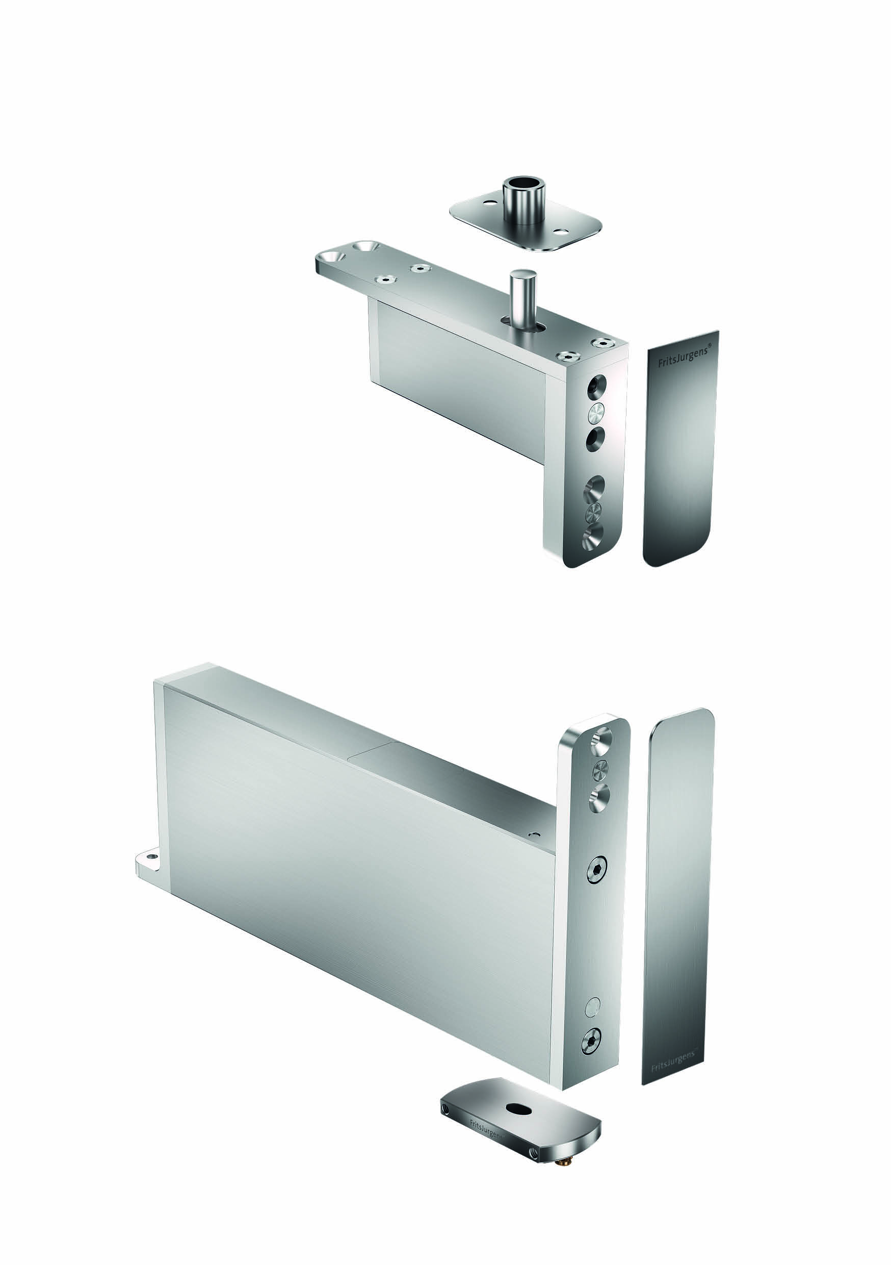 FritsJurgens pivot door hinges can be fitted in doors of all conceivable lengths and widths up to a maximum weight of 500 kg. The door should be a minimum of 40 mm thick and can be made of any type of material: glass, steel, wood, etc.